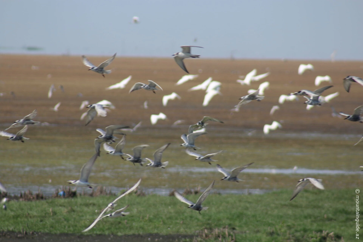 Most bird species listed in Azerbaijan’s “Red Book” inhabit the National Park and its surrounding areas. A total of 248 bird species, more than 30 fish species, and many other animal species live here. Nearly 300 bird species inhabit the National Park each year. These include the Dalmatian pelican, greater flamingo, black stork, white-tailed eagle, imperial eagle, grey partridge, francolin, little bustard, purple swamphen, avocet, greater flamingo, and others. Every year, many bird species migrate here to overwinter from Western Siberia, Kazakhstan, the Southern Urals, and Northern Europe.